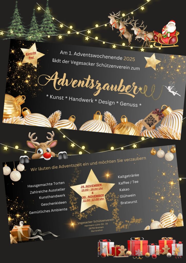 Weihnachten kommt bekanntlich immer überraschend. Um die Überraschung abzumildern, gibt es den Advent. Und pünktlich gibt es deshalb zum ersten Advent den „Adventszauber“ beim Vegesacker Schützenverein. Dieses Jahr am 29. und 30. November.
